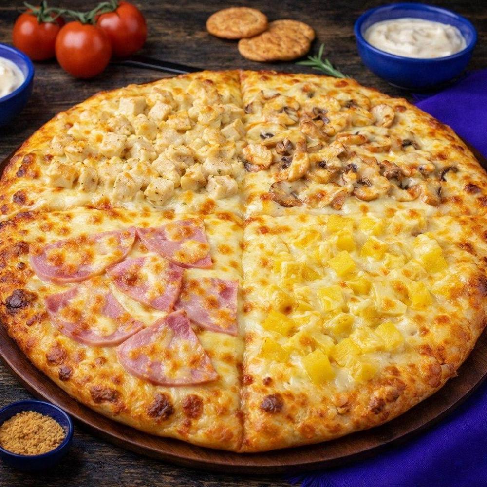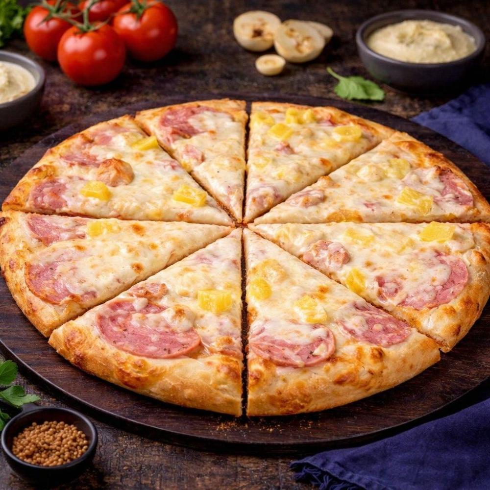 Фирменный соус, куриное филе, ветчина, ананас, грибы, сыр моцарелла.
