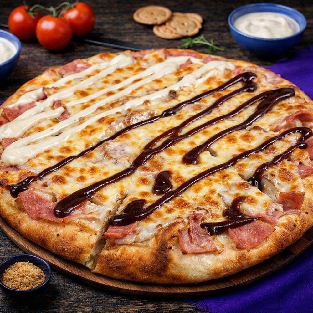 Фирменный соус, ветчина, сыр моцарелла, чесночный соус, соус барбекю