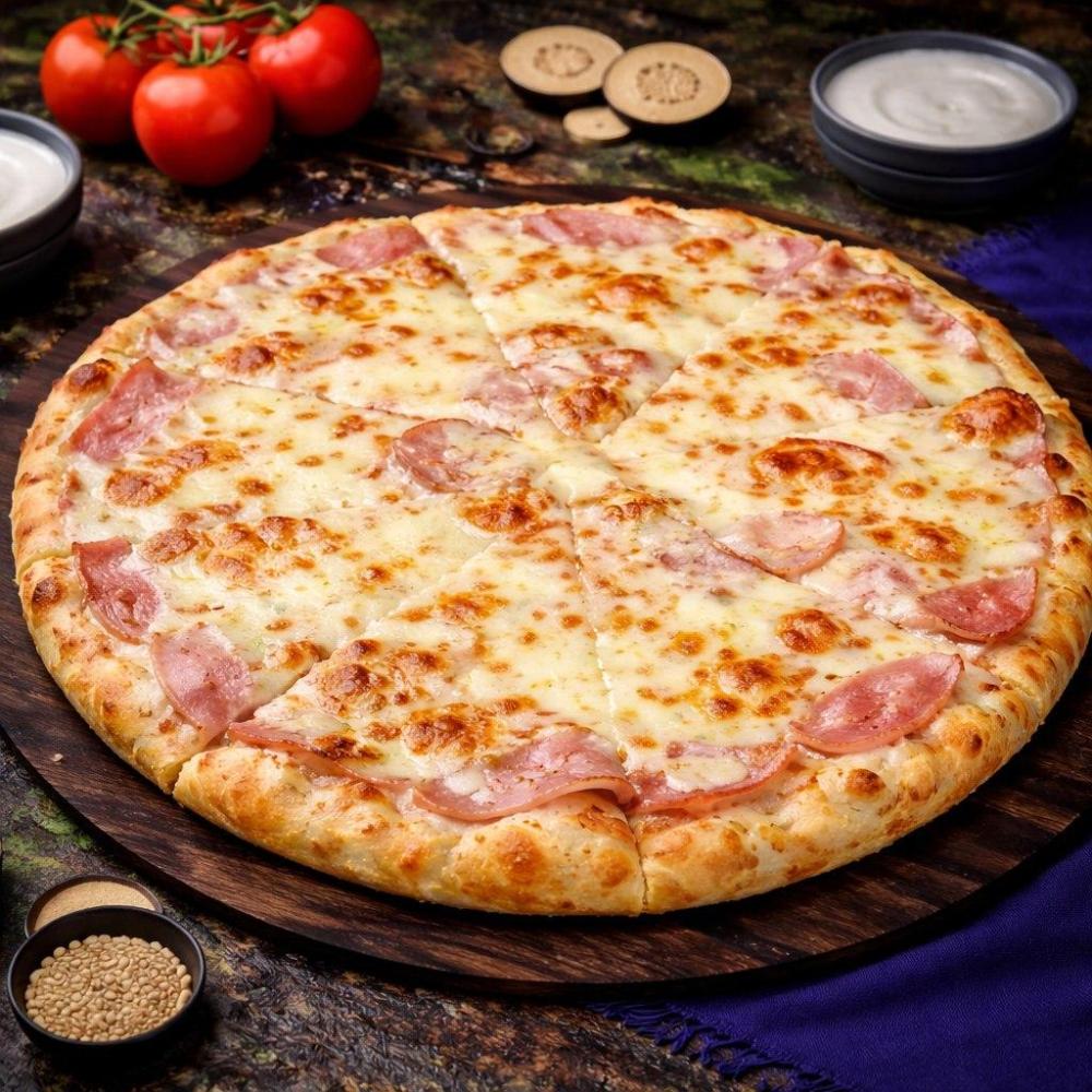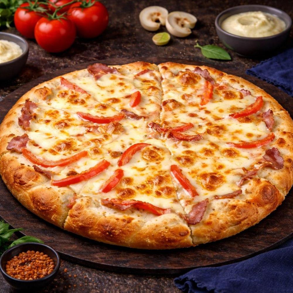 Фирменный соус, бекон, ветчина, сыр моцарелла.