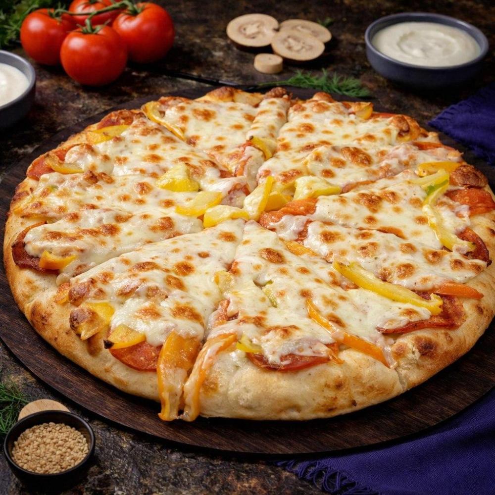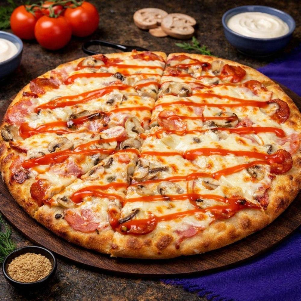 Фирменный соус, ветчина, пепперони, грибы, болгарский перец, сыр моцарелла, соус чили.