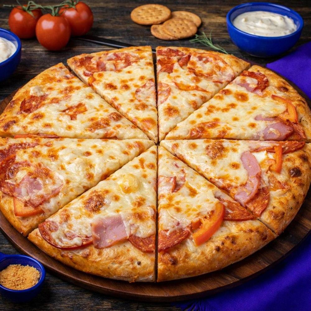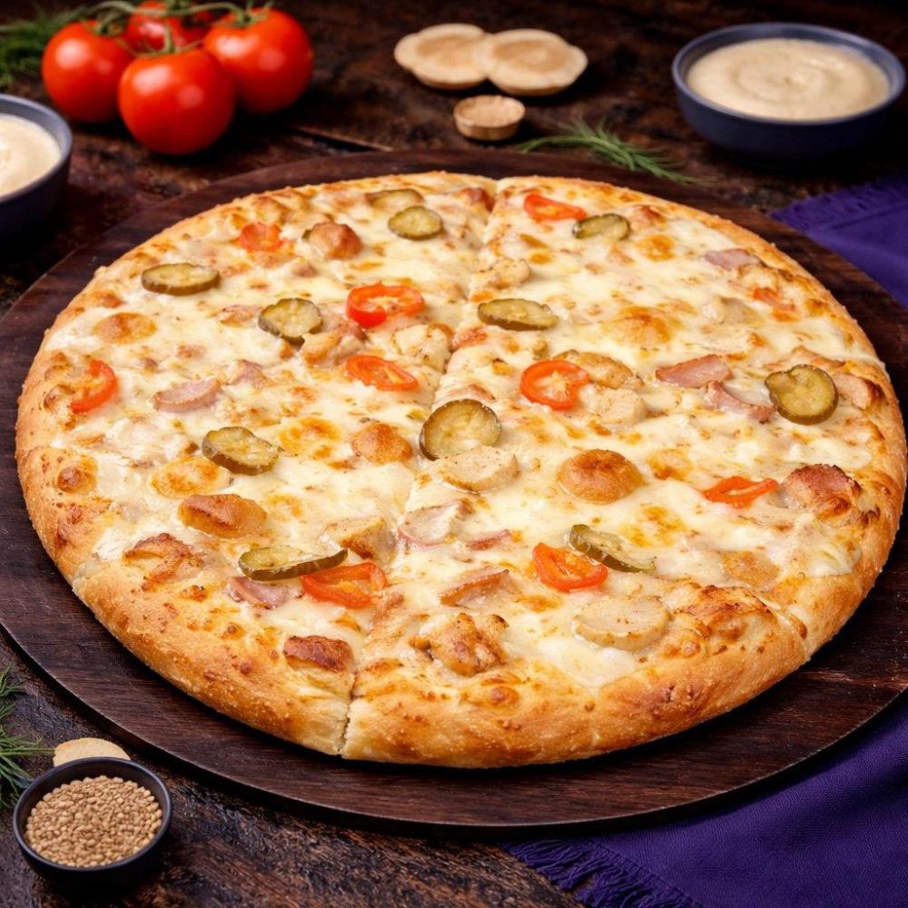 Фирменный соус, копченая свинина, куриное филе, болгарский перец, помидоры, соленые огурцы, грибы, сыр моцарелла
