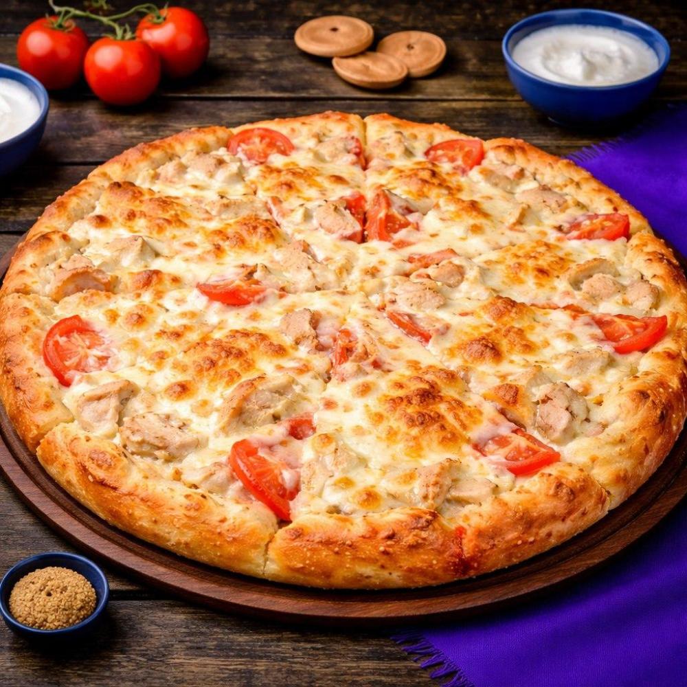 Фирменный соус, куриное филе, помидоры, грибы, сыр моцарелла.