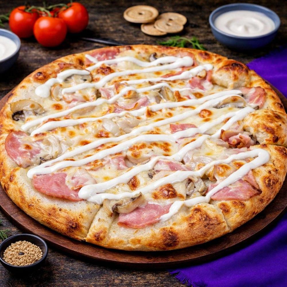 Фирменный соус, ветчина, грибы, сыр моцарелла, грибной соус