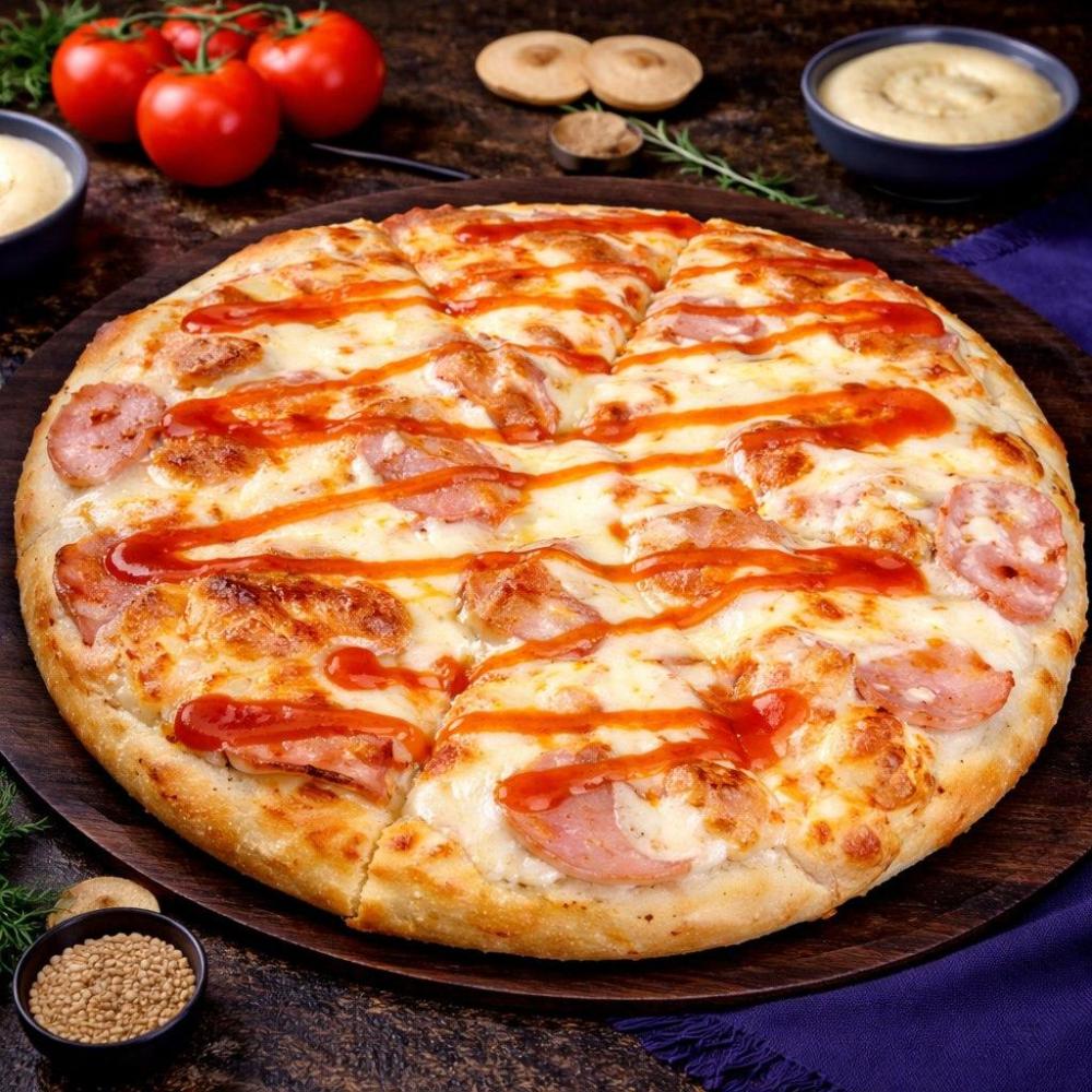 Фирменный соус, ветчина, куриное филе, перец чили, сыр моцарелла, соус чили.