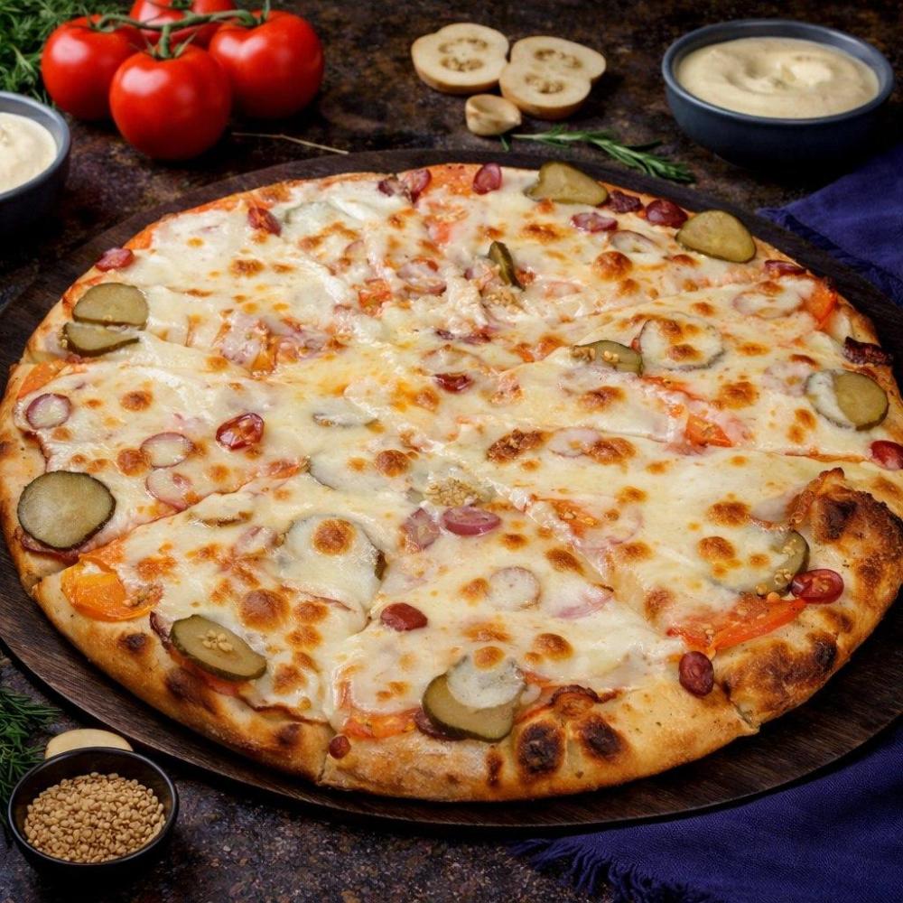 Фирменный соус, пепперони, охотничьи колбаски, помидоры, соленые огурцы, сыр моцарелла