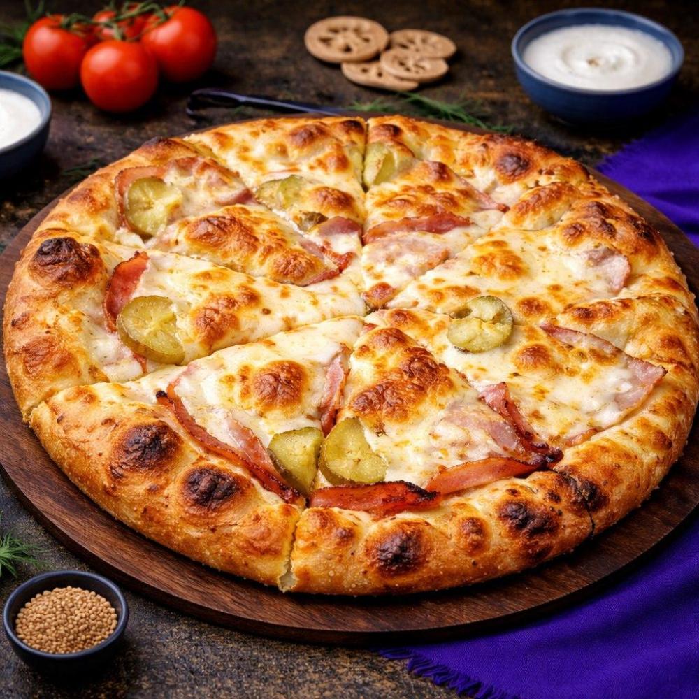Фирменный соус, бекон, пепперони, соленые огурцы, сыр моцарелла.
