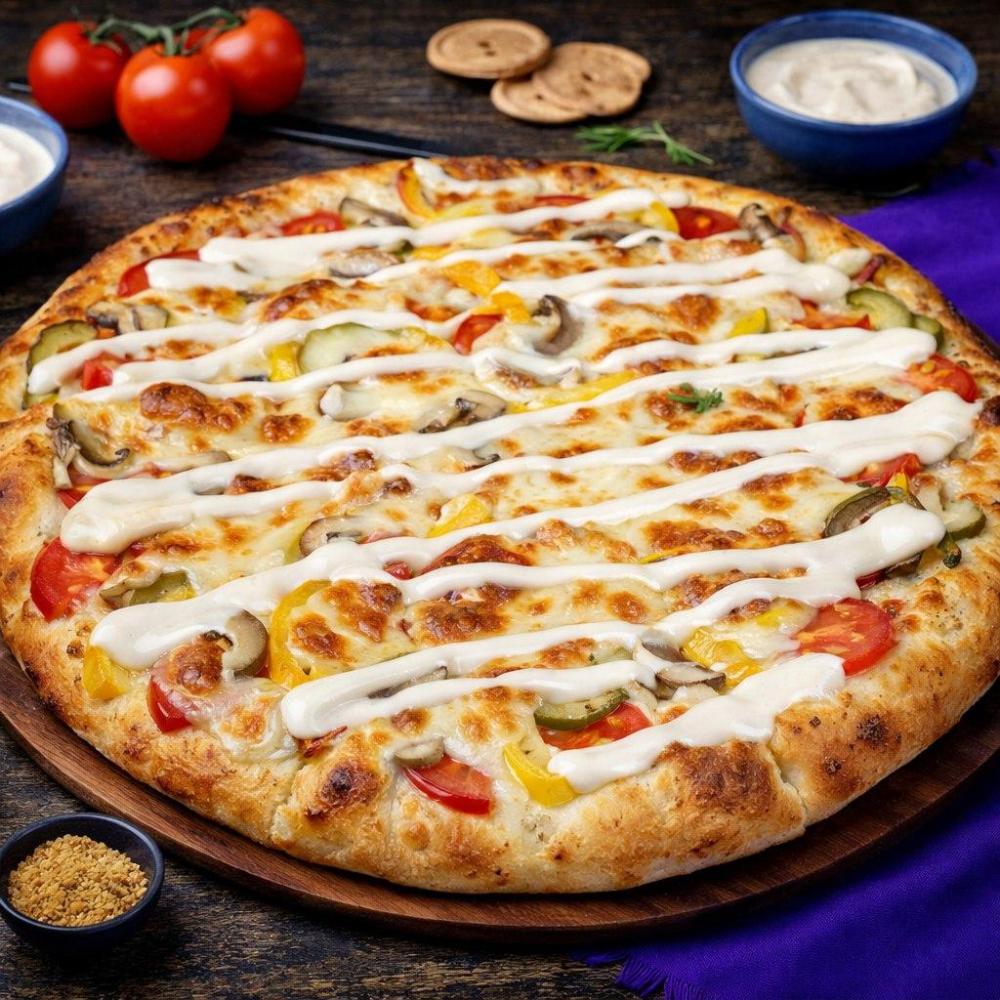 Фирменный соус, грибы, болгарский перец, помидоры, сыр моцарелла, соус чесночный.