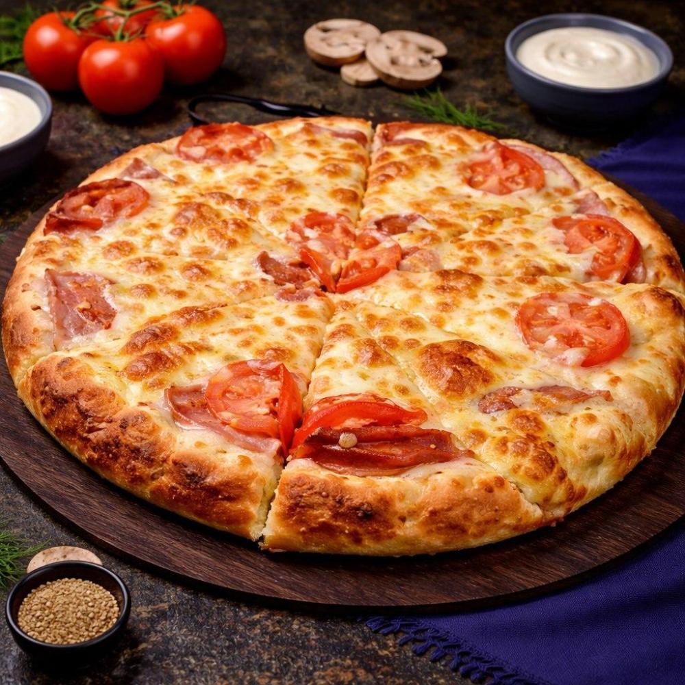 Фирменный соус, пепперони, ветчина, куриное филе, помидоры, сыр моцарелла