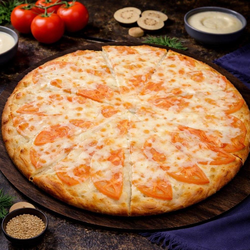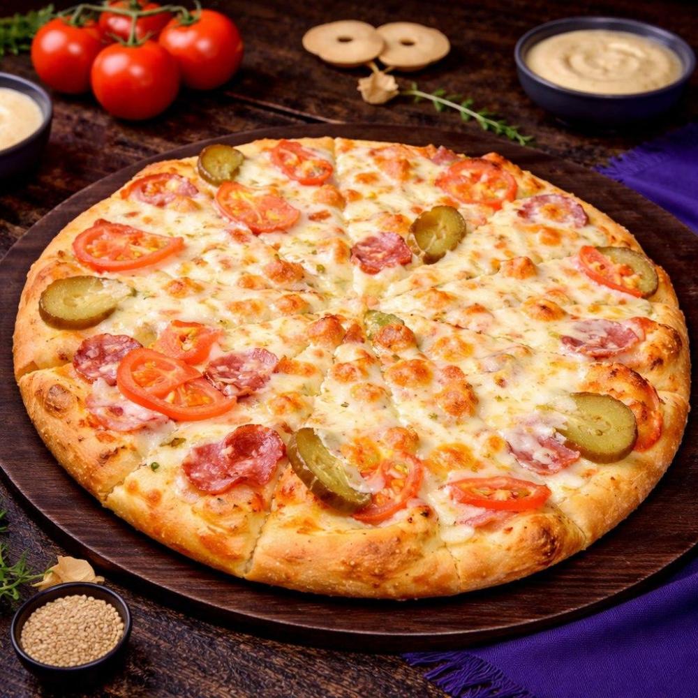 Фирменный соус, пепперони, ветчина, куриное филе, помидоры, соленые огурцы, сыр моцарелла.