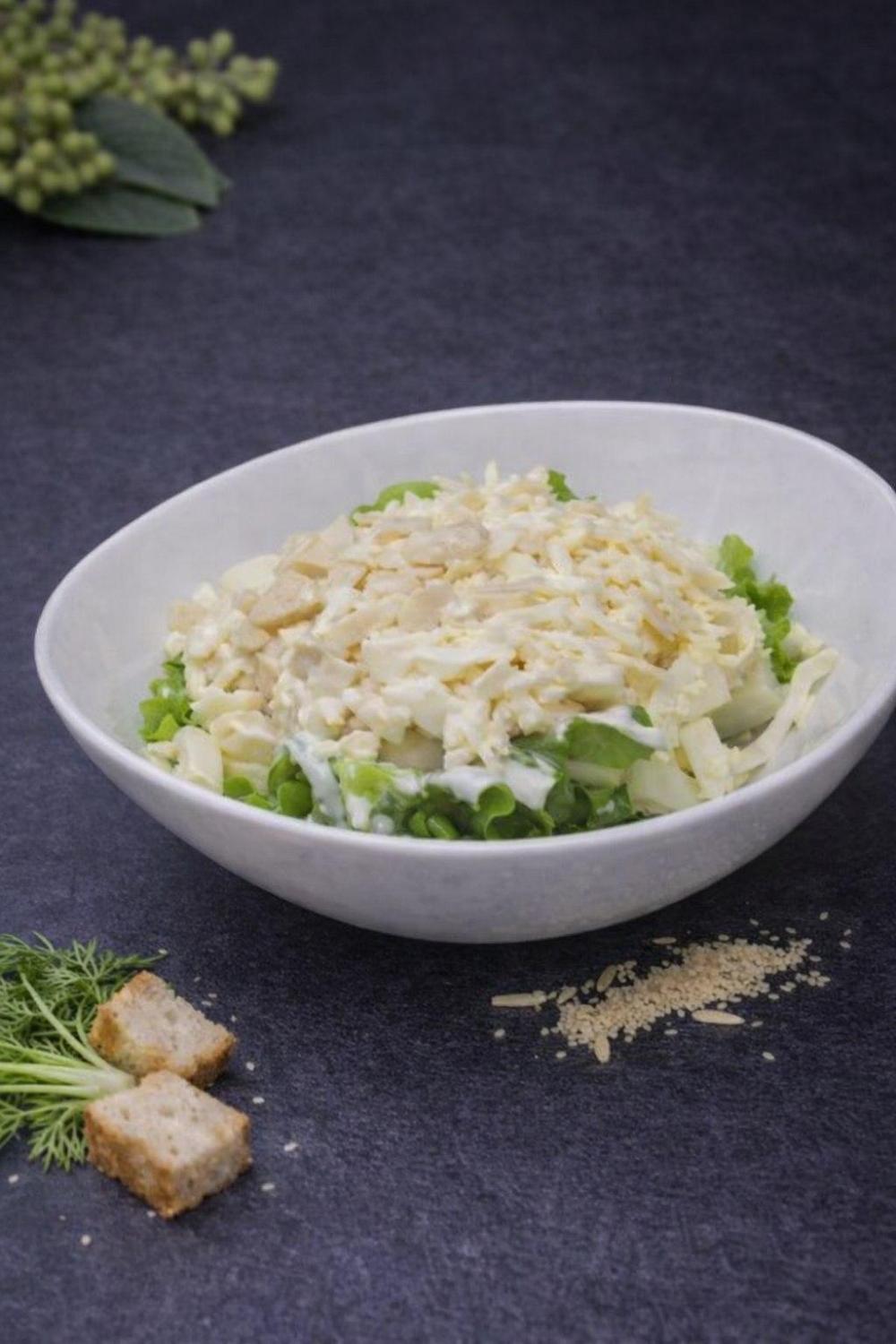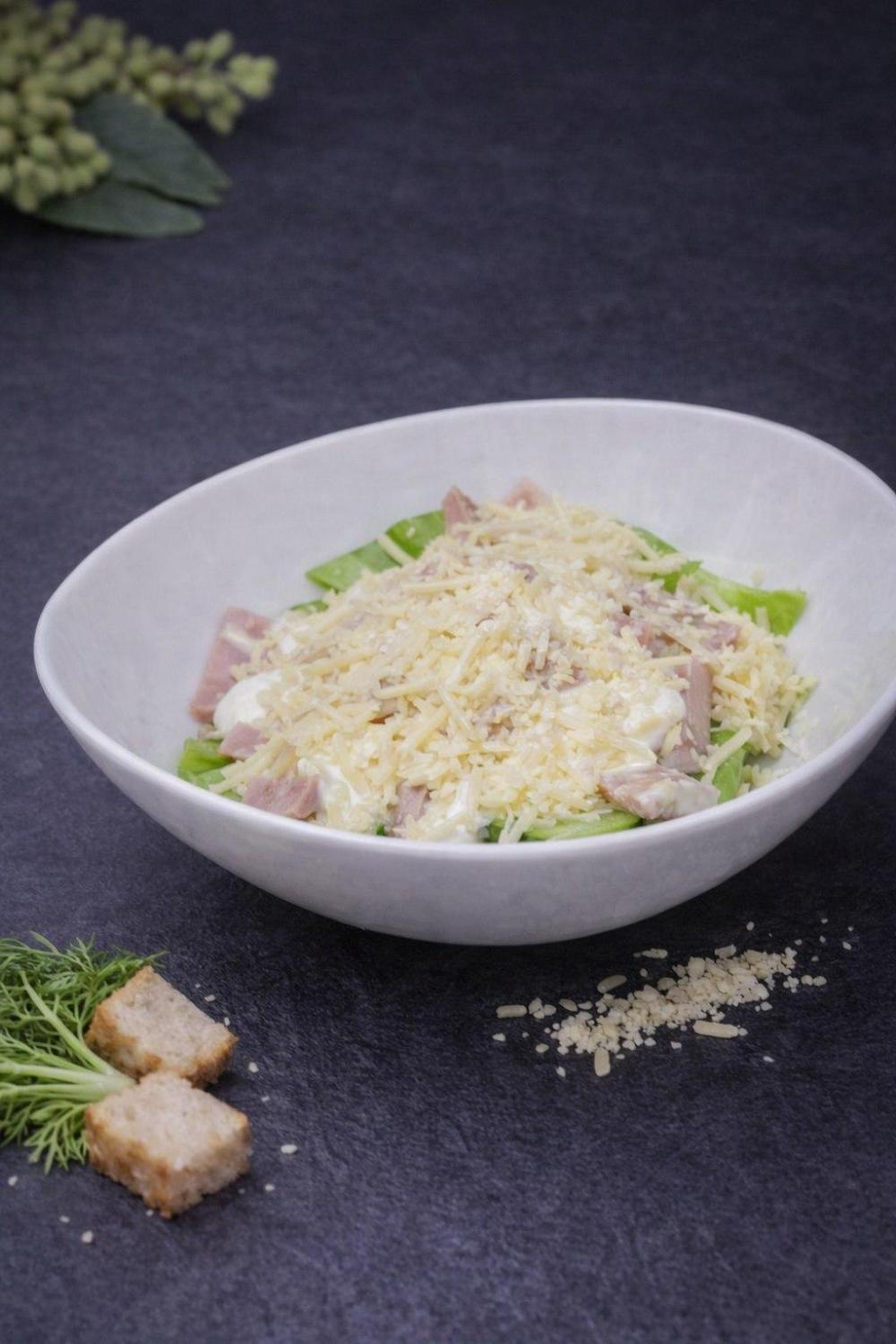 Лист салата, ветчина, свежий огурец, соус чесночный, сыр