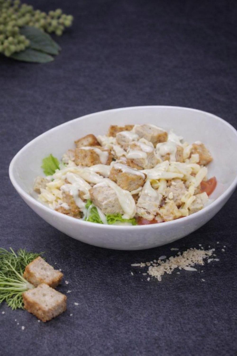 Лист салата, помидор, куриное филе, сухари, пармезан, соус чесночный