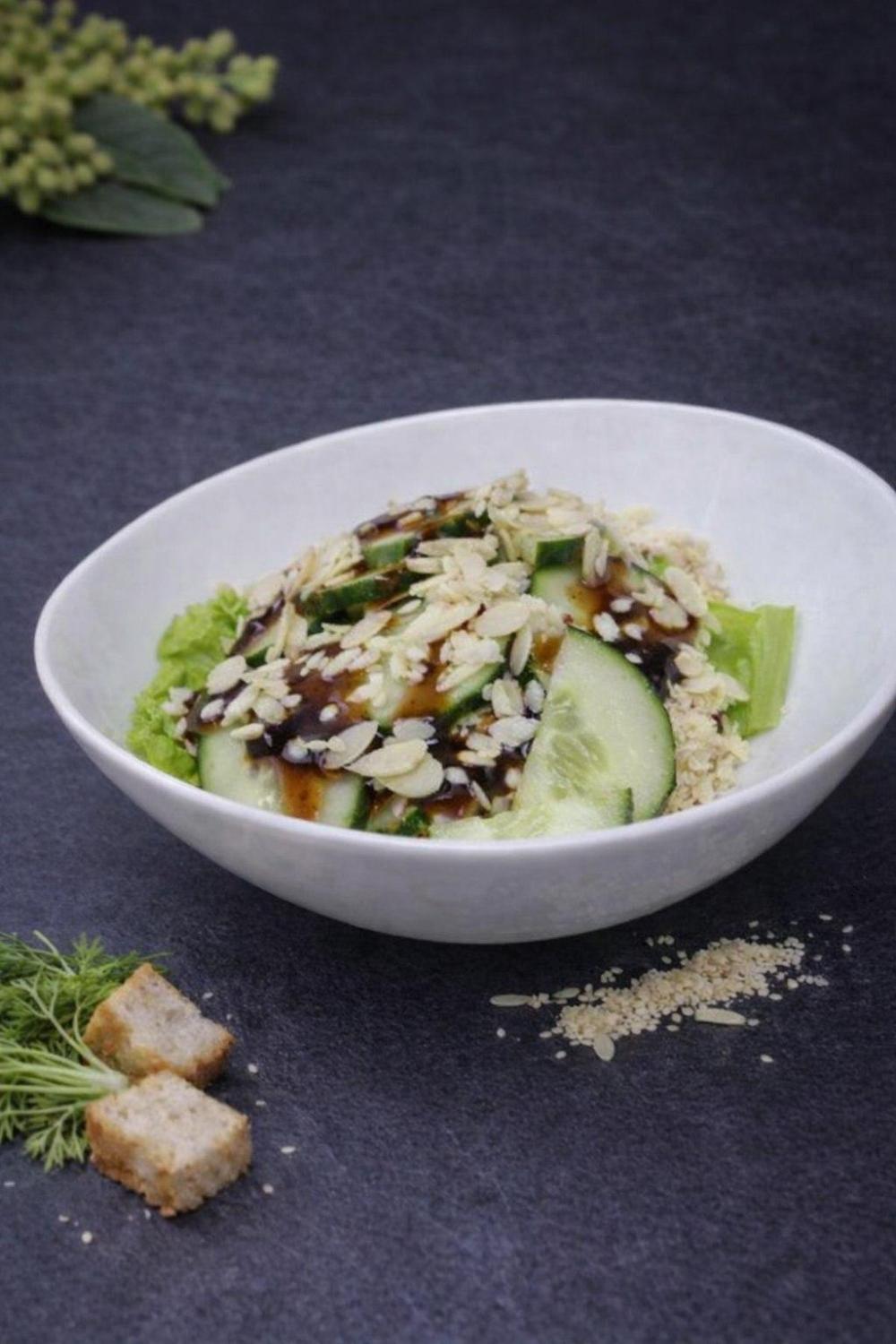 Лист салата, свежий огурец, куриное филе, соус терияки, лепестки арахиса