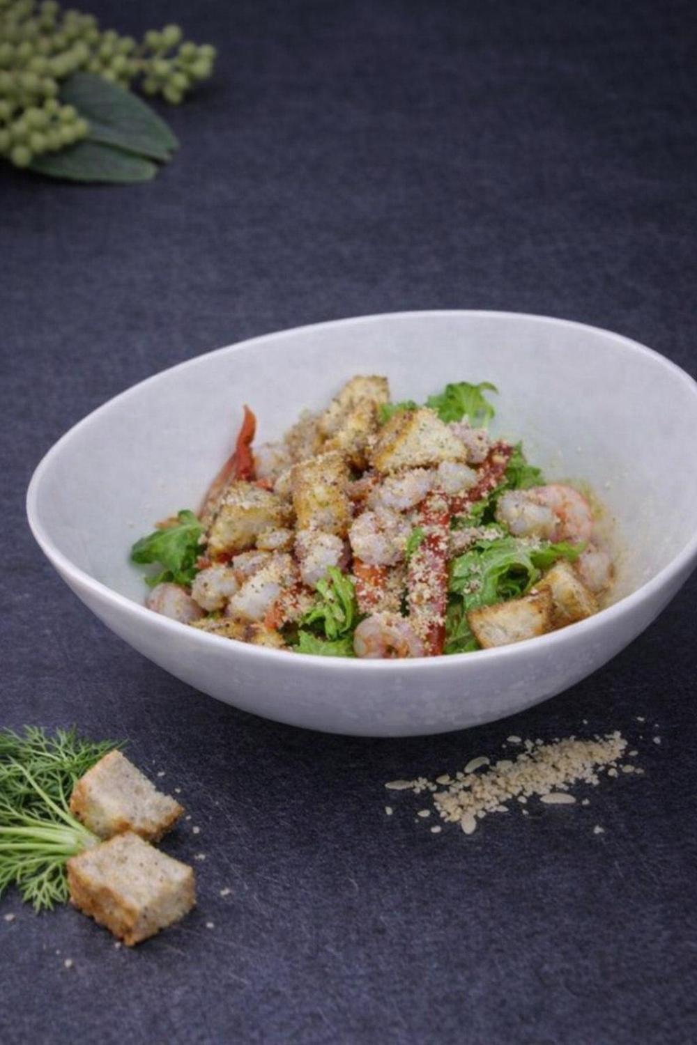 Лист салата, креветки, помидор, сухарики, соус айоли, сыр