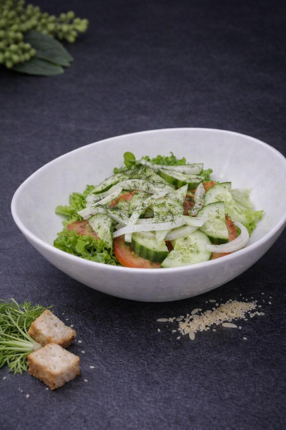 Лист салата, помидор, свежий огурец, перец болгарский, масло растительное, лук