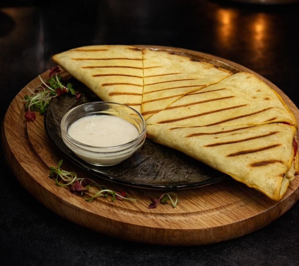 Тортилья, соус чили, копченая говядина, помидор,перец чили, сыр