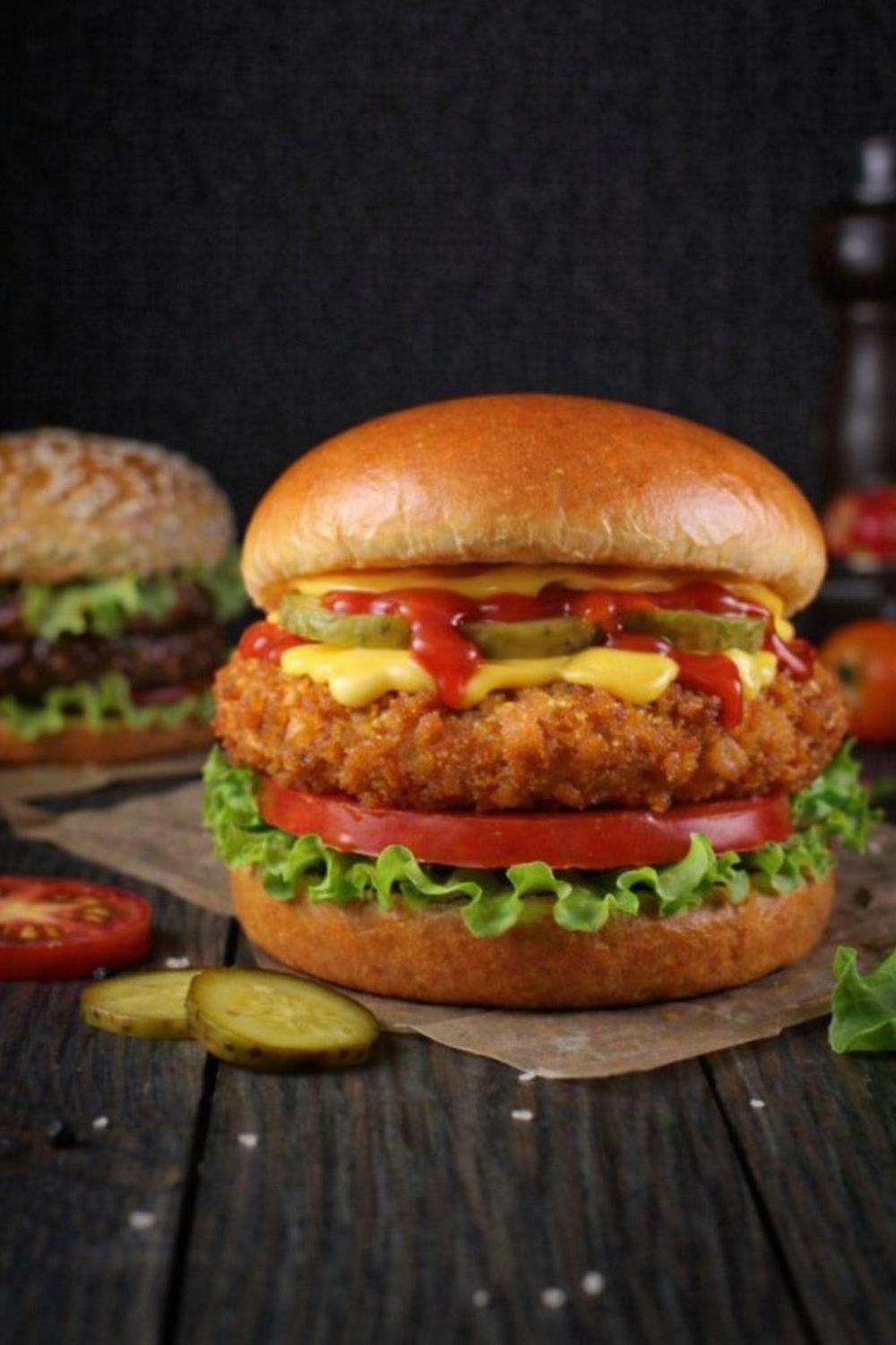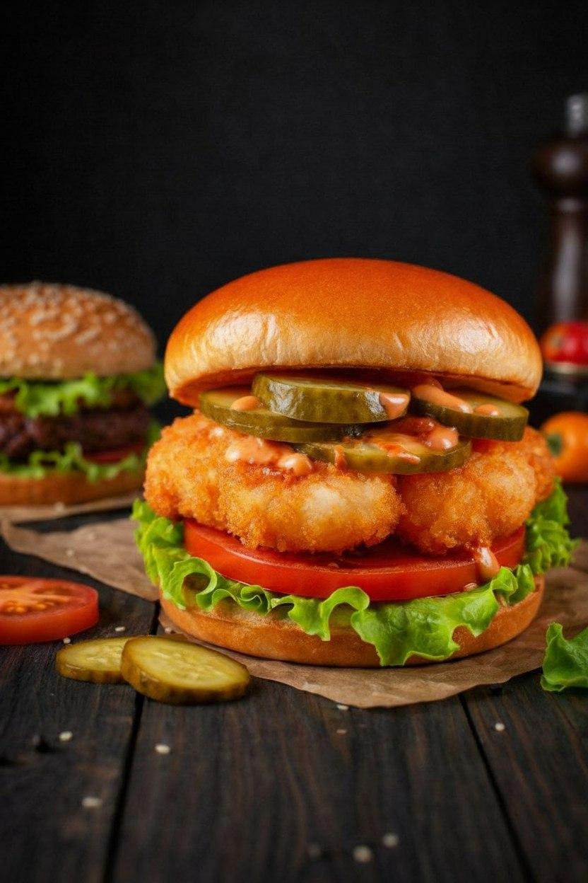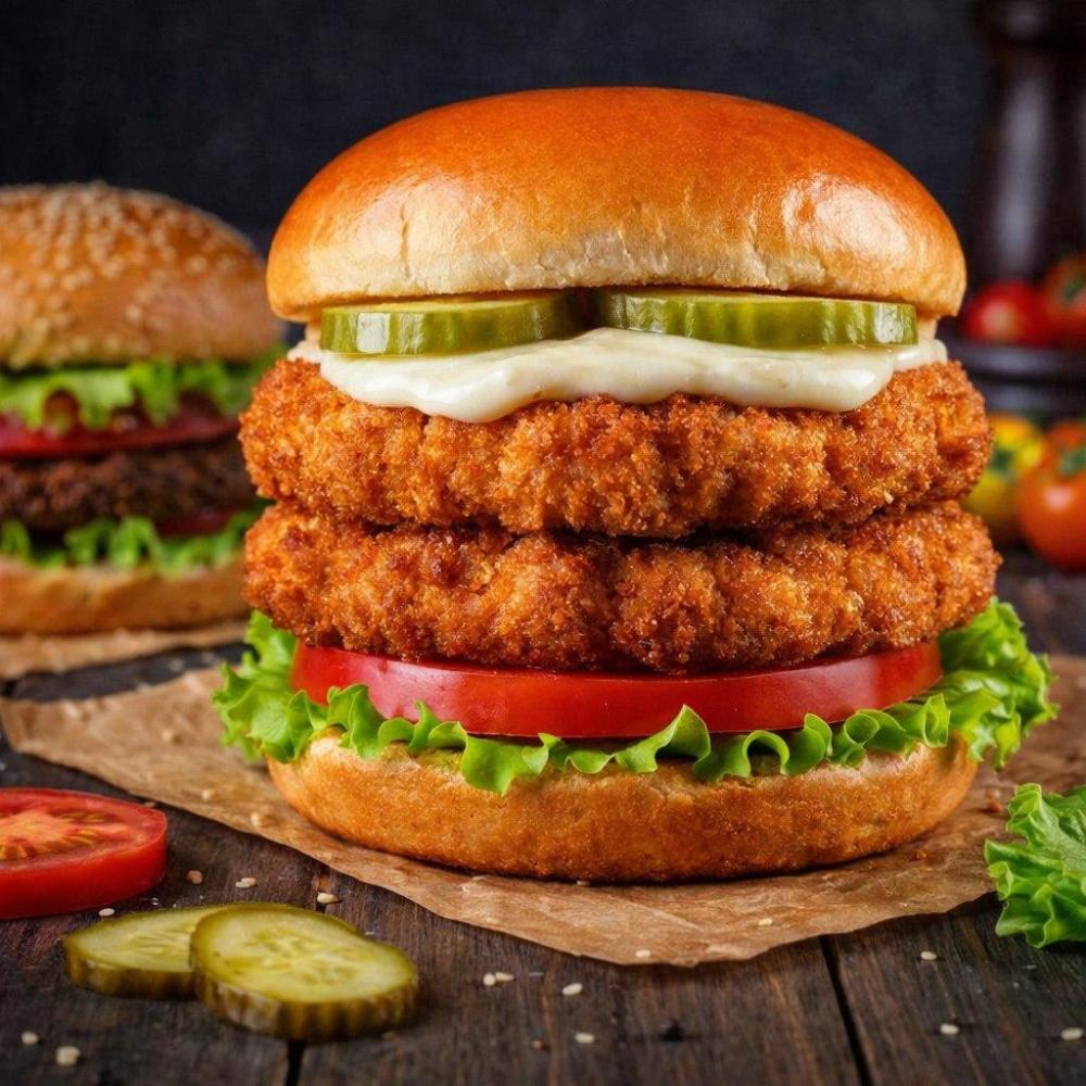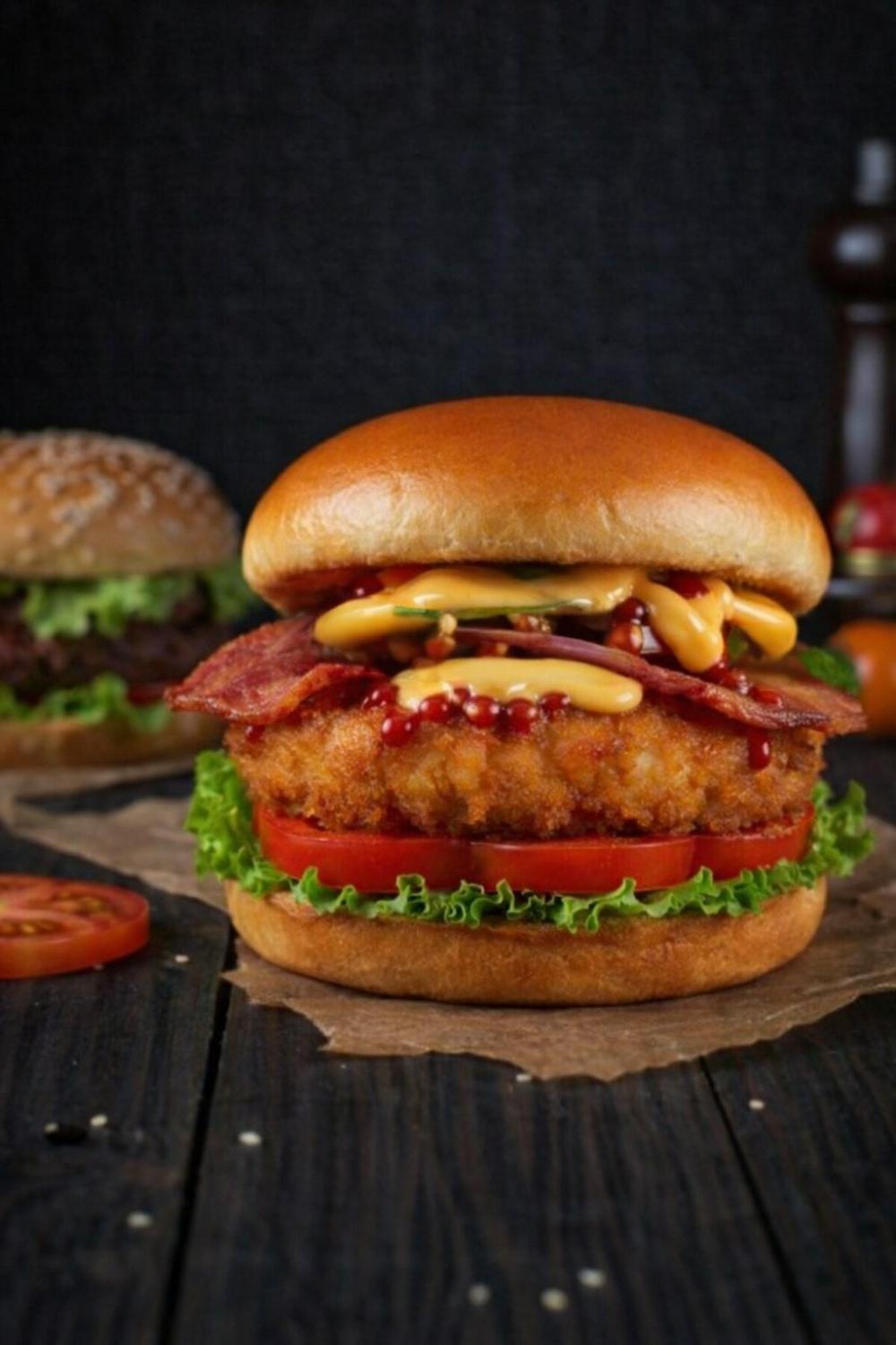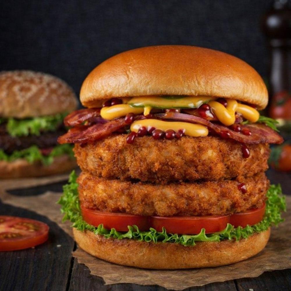 Домашняя булочка, кетчуп, лист салата, свежие ломтики томата, две куриные котлеты в панировке, сырный соус, ломтики бекона, соленый огурец, соус барбекю
