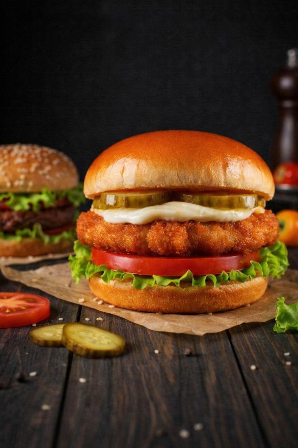 Домашняя булочка, чесночный соус, лист салата, свежие ломтики томата, куриная котлета в панировке, соленый огурец, сыр моцарелла.