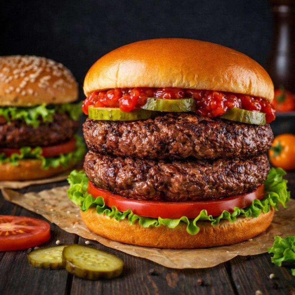 Домашняя булочка, лист салата, свежие ломтики томата, две говяжьих котлеты, сырный соус, соленый огурец, острая аджика
