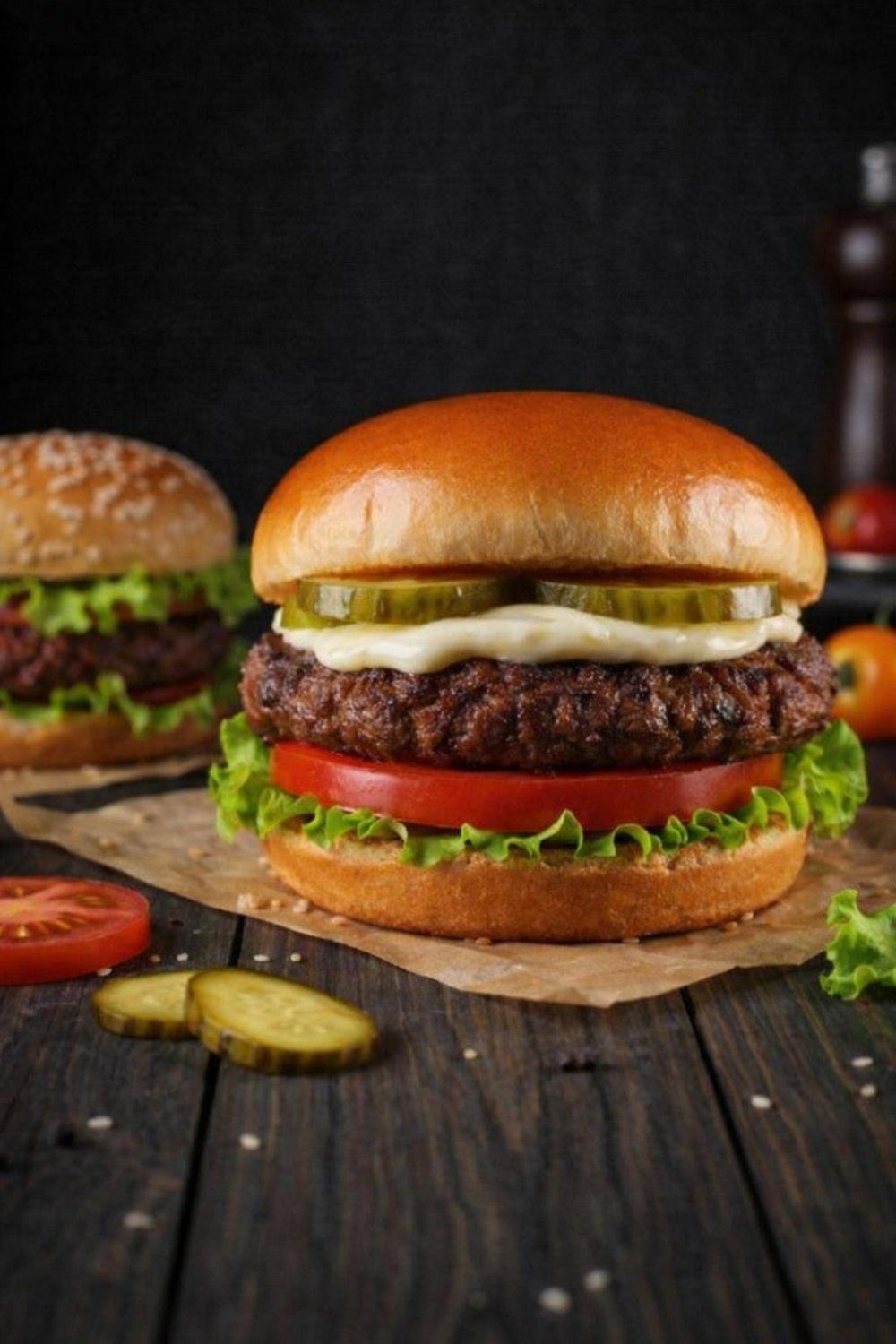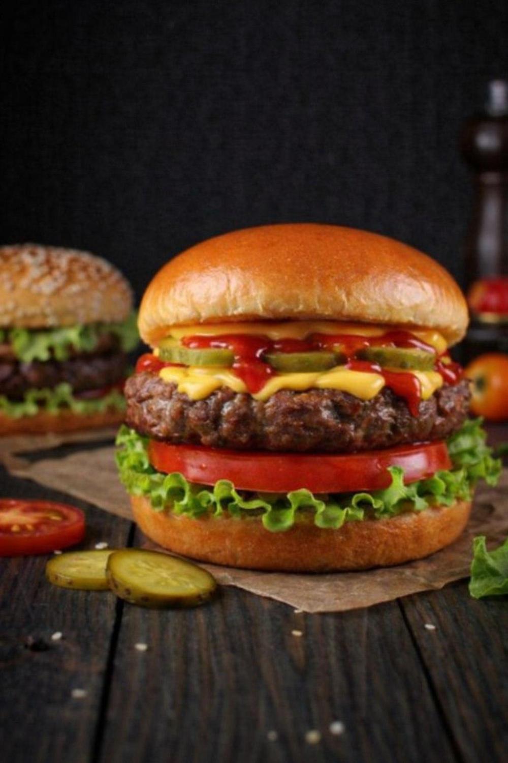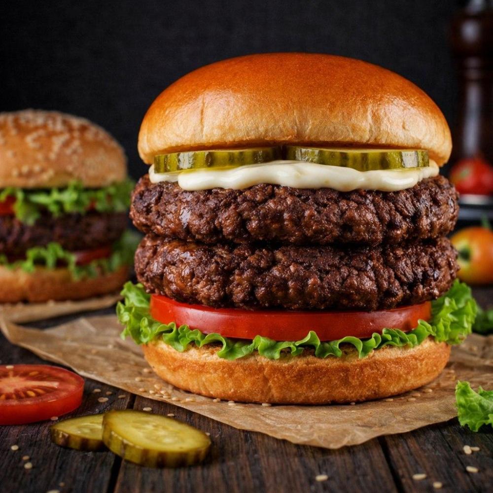 Домашняя булочка, чесночный соус, лист салата, свежие ломтики томата, две говяжьих котлеты, соленый огурец, сыр моцарелла.