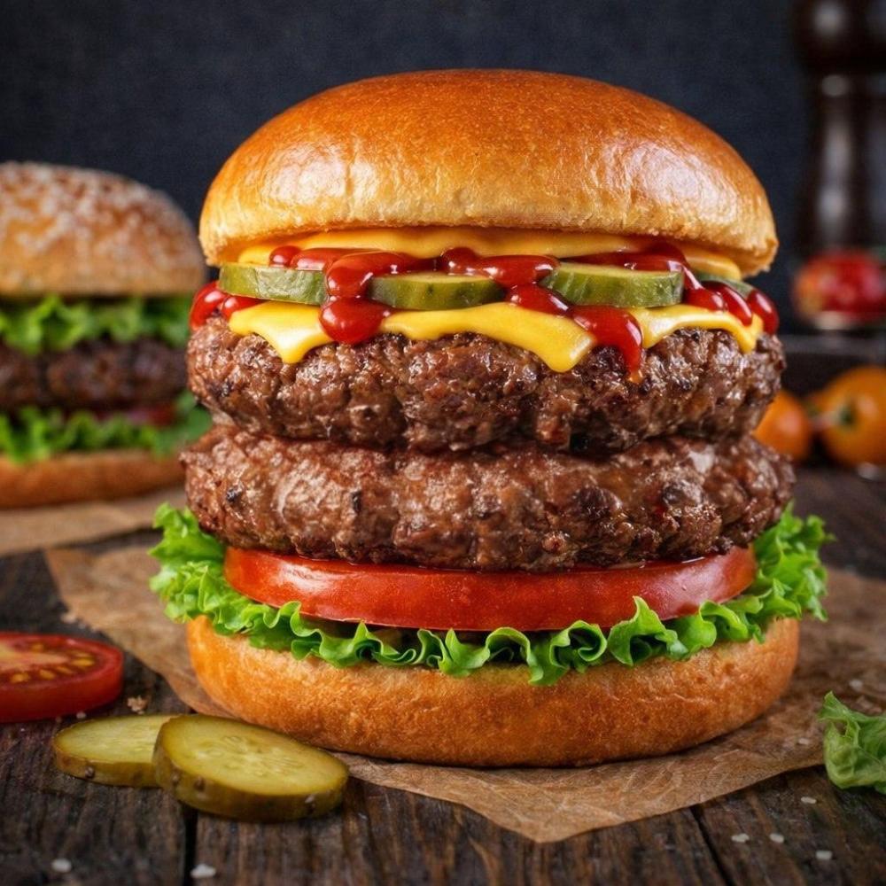 Домашняя булочка, кетчуп, лист салата, свежие ломтики томата, две говяжьих котлеты, сырный соус, соленый огурец, соус барбекю