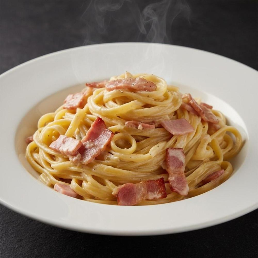 Макароны фетучини, бекон, ветчина, сливки, чеснок, сыр