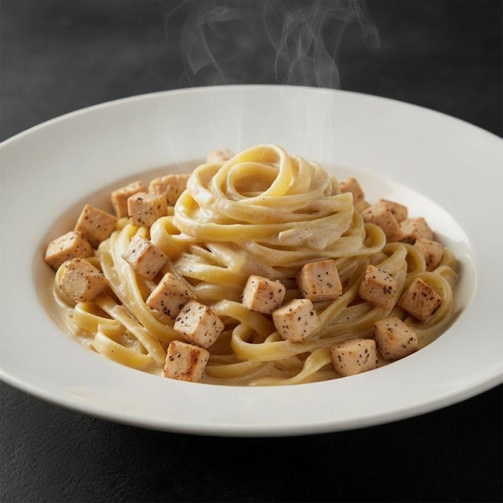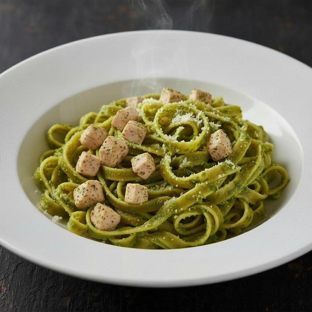 Макароны фетучини, куриное филе, чеснок, сливки, сыр, соус песто