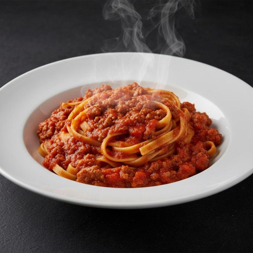 Макароны фетучини, говяжий фарш, томатный соус, сыр
